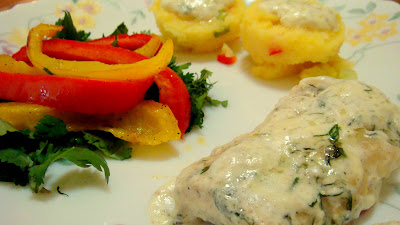 with Savory Polenta and Balsamic Baked Peppers on a Bed of Fresh Cilantro.